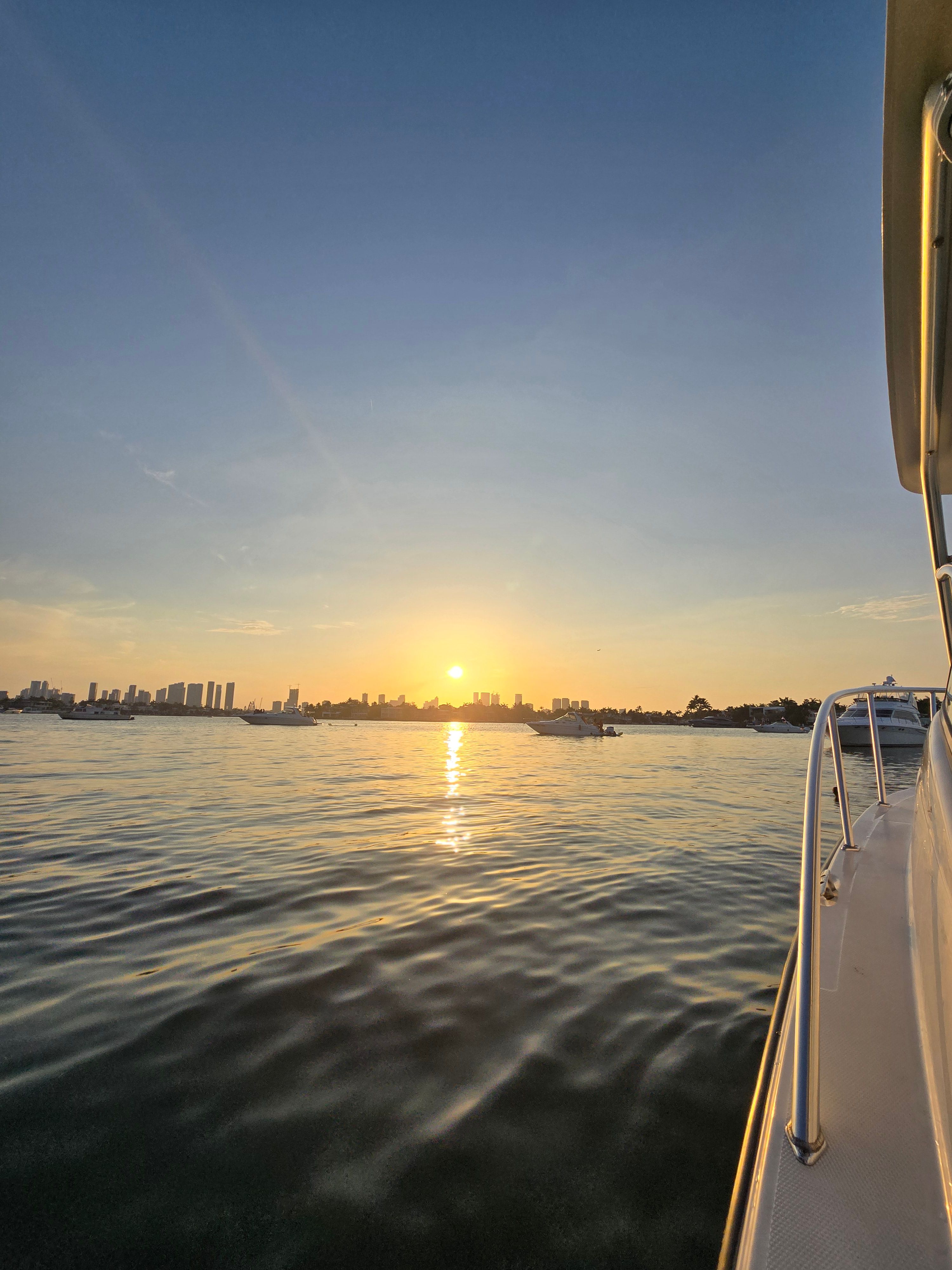 Your captain knows these waters like the back of their hand, and they'll take you to all the best spots for catching that perfect sunset. We launch from Miami and cruise through some of the calmest, most scenic areas around – think protected bays and channels where you can actually relax without getting bounced around. The whole vibe is laid-back from start to finish. You've got a private boat, so no strangers, no rush, just you and whoever you bring along for the ride. Your captain handles all the navigation while you focus on soaking up those golden hour vibes. The boat comes equipped with a cooler full of ice and water, plus Bluetooth so you can play whatever music sets the mood. Most people bring their favorite drinks (just no glass bottles for safety) and some snacks to make it feel like a proper floating party.